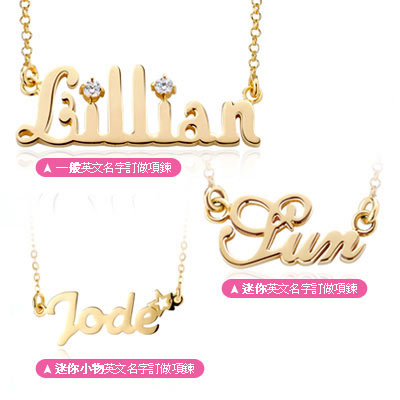 (例:Mary,純銀版,小圓鍊,2#字型,粉紅鑽)。
